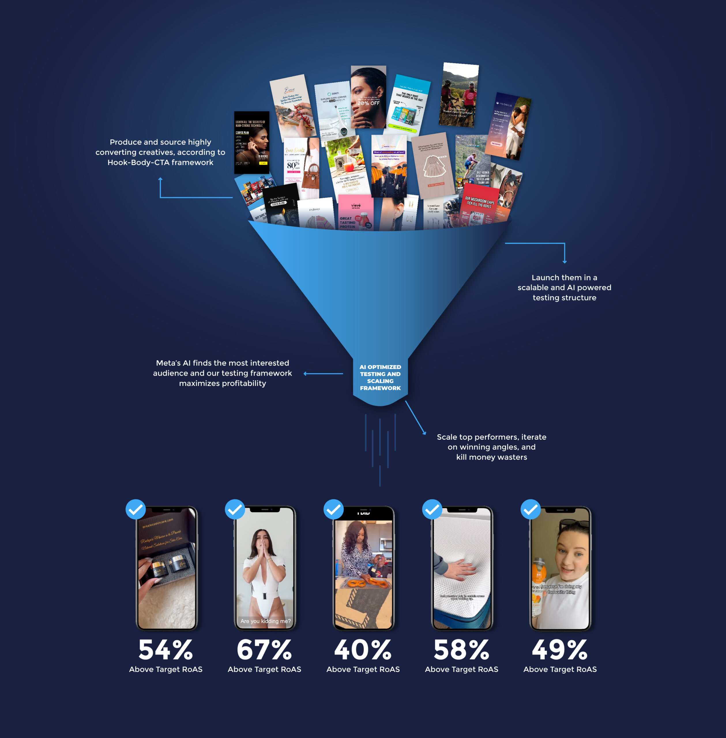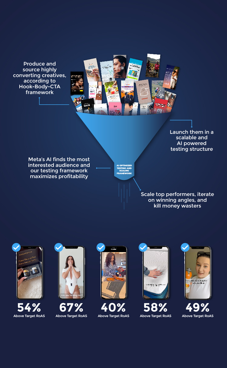 - Strategic Creative Production Iteration: Using the Hook-Body-CTA framework, we continuously test and refine angles and creatives to ensure your campaigns remain fresh and effective.