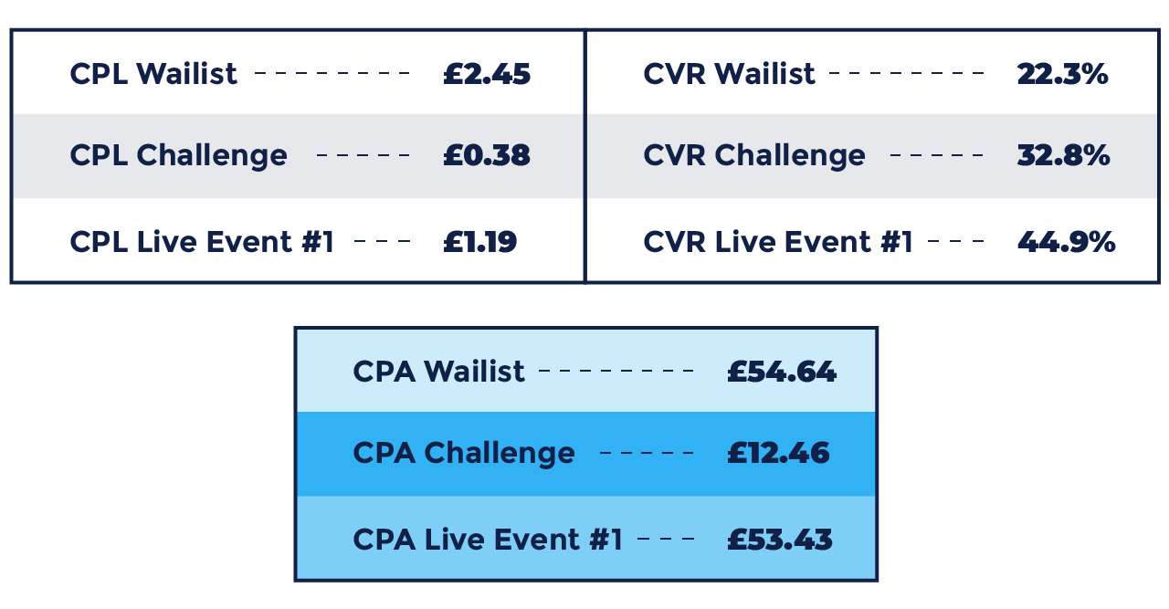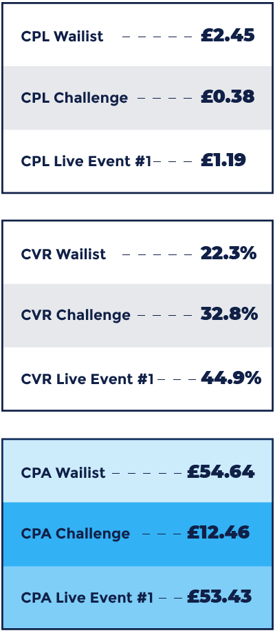 We will promote the Live events organically and to the existing email lists, with the goal to reduce the overall CPL of that specific magnet. Given the high conversion rate, if the CPL would drop sensitively, the results would be potentially better than the challenge.